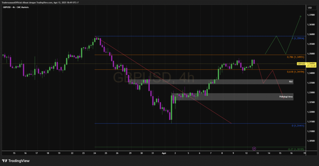 Jika harga mampu menembus dan menutup candle H4 di atas 1.3495 dengan volume kuat, peluang naik menuju 1.3591 semakin terbuka.