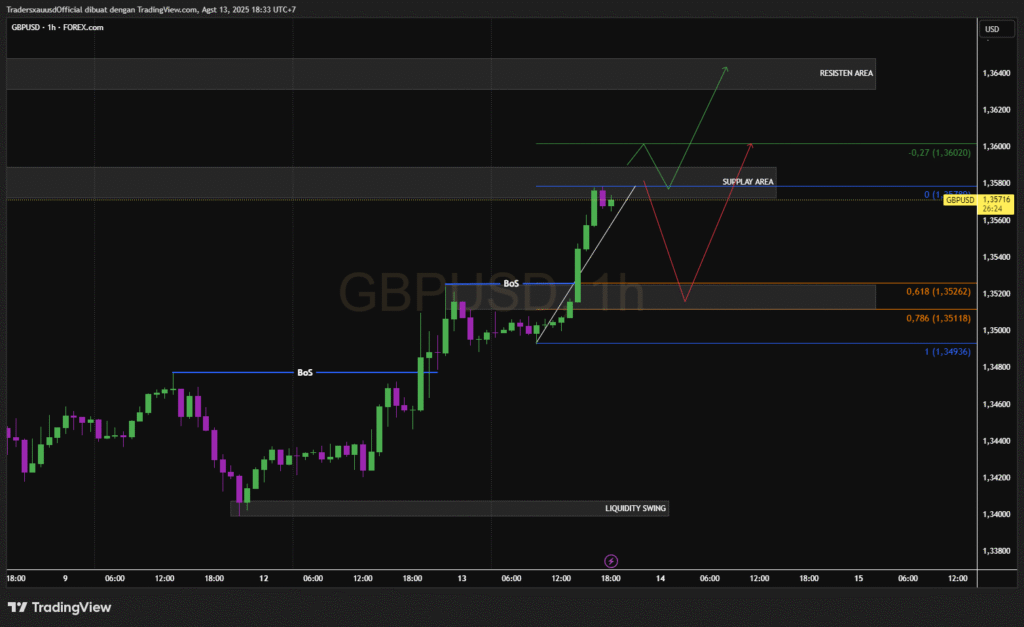 Pasangan mata uang GBP/USD saat ini berada di fase krusial setelah reli signifikan pada sesi sebelumnya. Berdasarkan chart timeframe H1, harga telah menembus struktur penting (Break of Structure / BoS) dua kali, menandakan dominasi buyer. Namun, saat ini harga sedang menguji supply area yang bisa menjadi titik balik pergerakan harga.