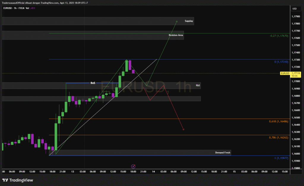 Selain itu, Break of Structure (BoS) pada 1.1680 mengindikasikan tren naik masih berpotensi berlanjut, selama area ini tetap bertahan sebagai support.